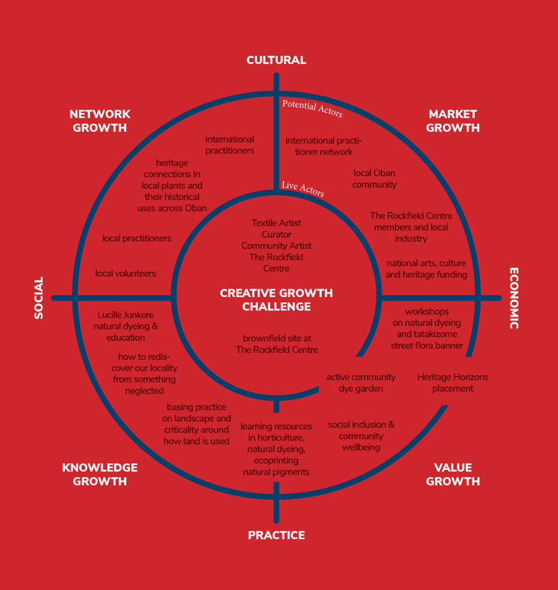 Eco Creative Cluster worked with pre-existing local networks, by creating a community dye garden on the grounds of The Rockfield Centre, thus helping to bring traditional dye methods back into Oban’s public consciousness. Eco Creative Cluster focused on creating a sense of place through building a network of volunteers and practitioners, and worked in collaboration with both groups to plan and grow a dye garden. Along with building this microcluster network, Eco Creative Cluster also created a programme of activities to share their knowledge of natural dyes and techniques with the wider community. This led to the expansion of their network as they were able to connect with other dyers in the local region, and internationally, helping to build a web of knowledge by sharing processes and projects on how to grow and cultivate local plants in order to sustain a practice and make relevant heritage skills.