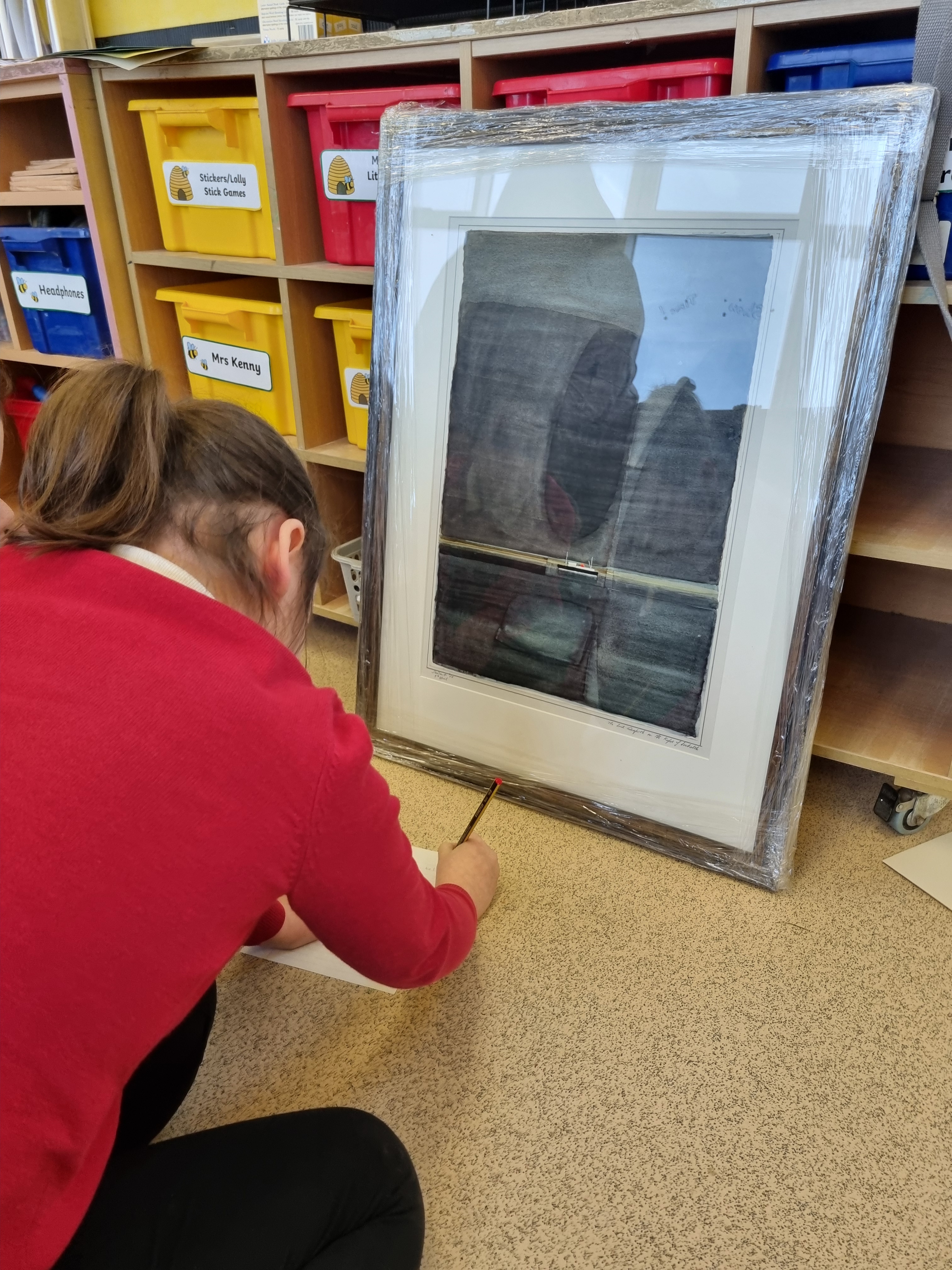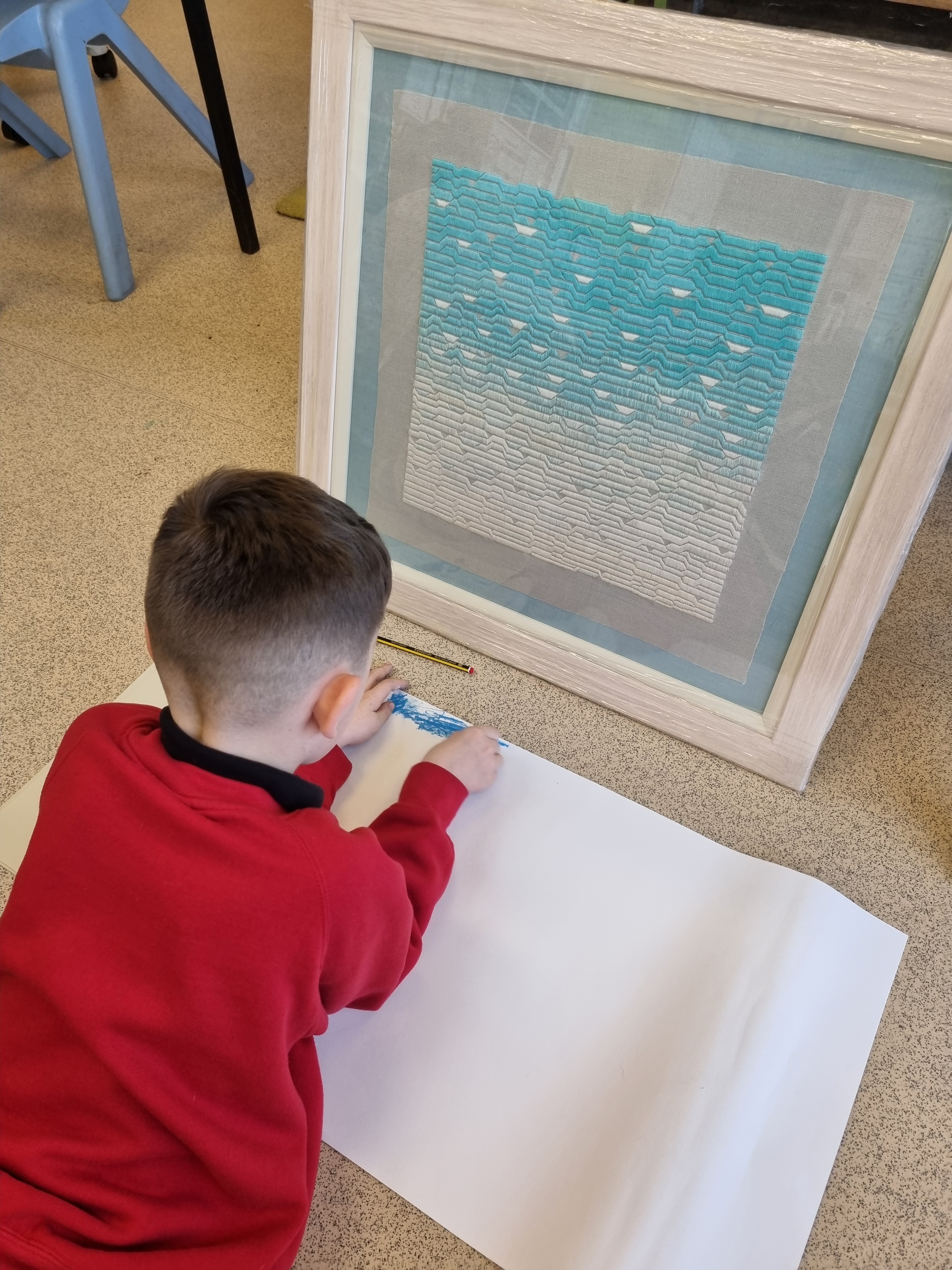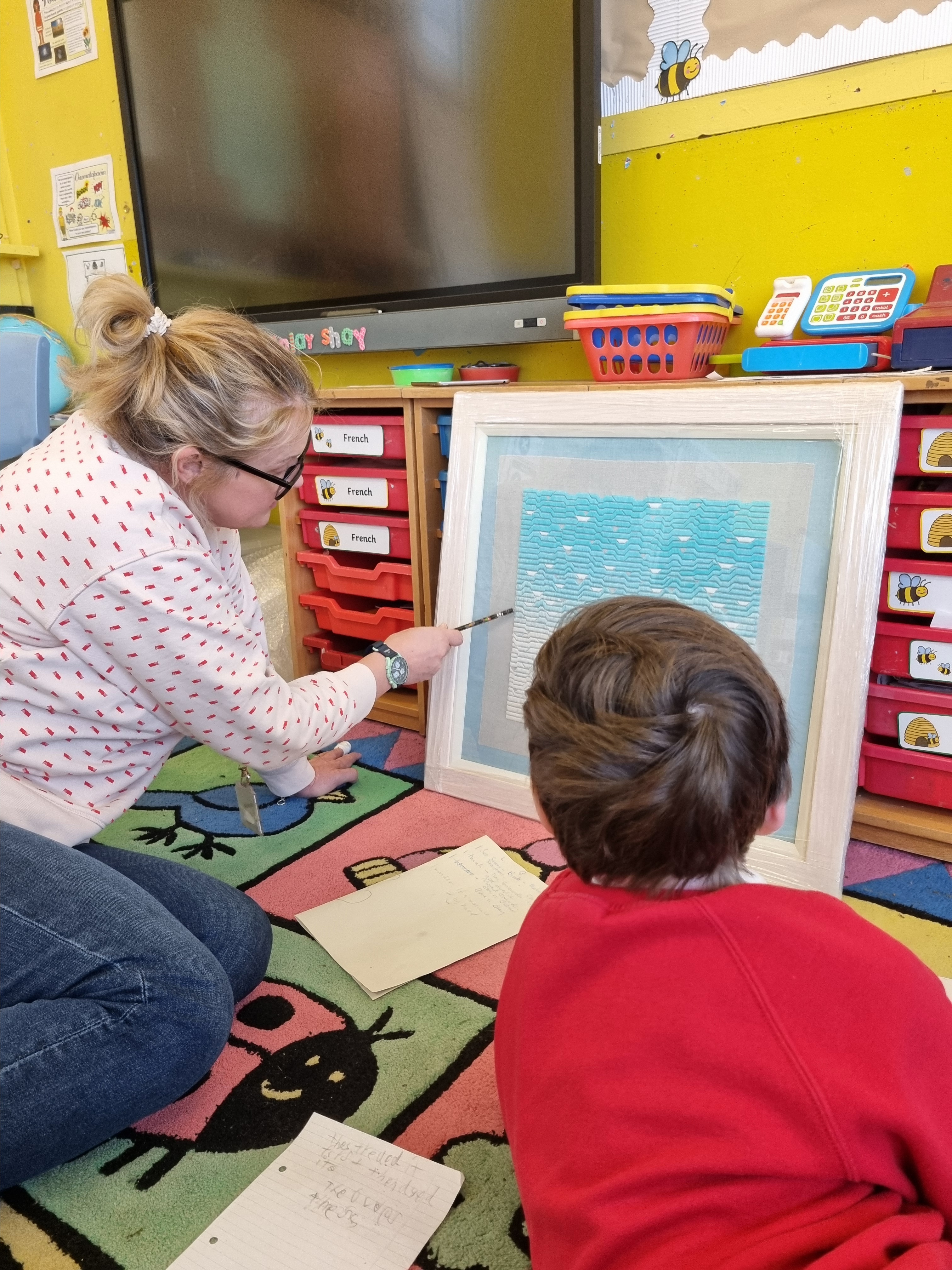 At the start of February 2024 Reconnected Project Manager, Rosalyn McKenna, visited Glenbarr Primary school, Kintyre, with a selection of artworks from the Argyll Collection. With a school role of just 5, Glenbarr were running an Arts & Literacy project in partnership with Dalintobar Primary School, Campbeltown, to allow the 5 children to mix and share learning with other pupils. Rosalyn was invited by learning support teacher, Elizabeth Nimmo, to lead a visual literacy session using the Argyll Collection as a starting point. Rosalyn selected a variety of seascape-themed works, including textiles, prints and paintings, and spent the day with the teachers and children exploring the artworks through discussion and practical art-based activities.